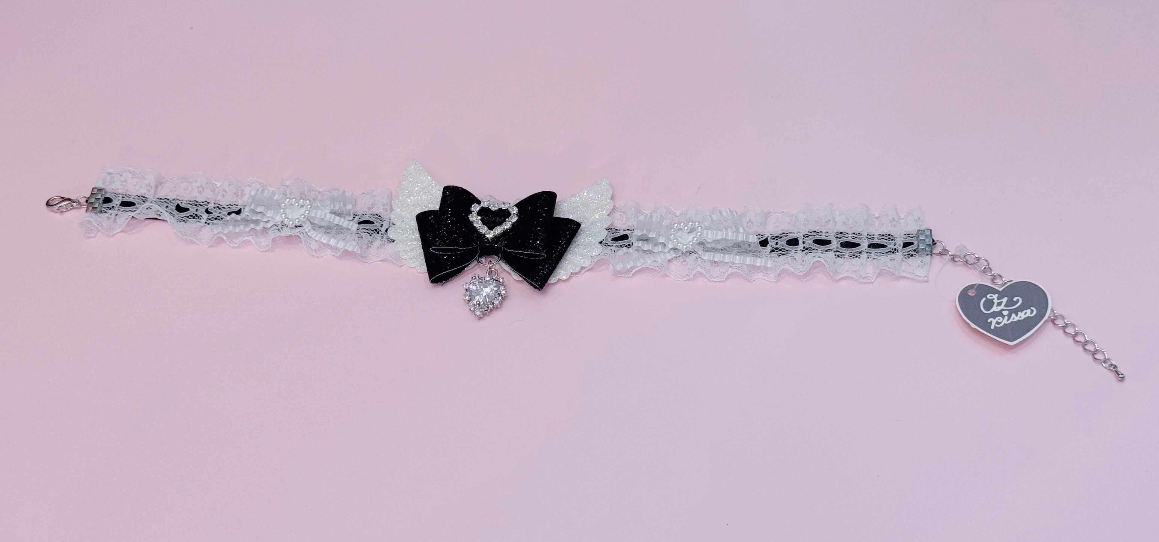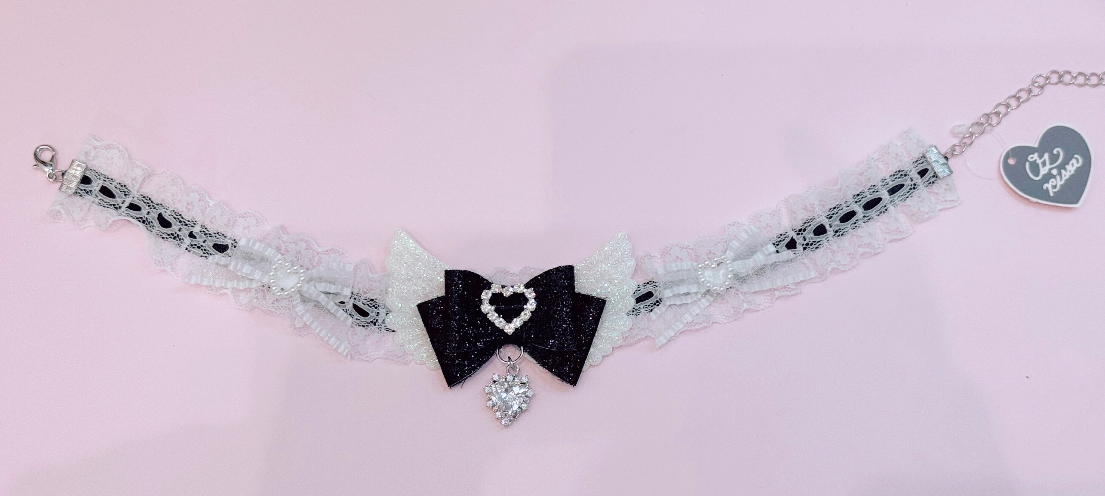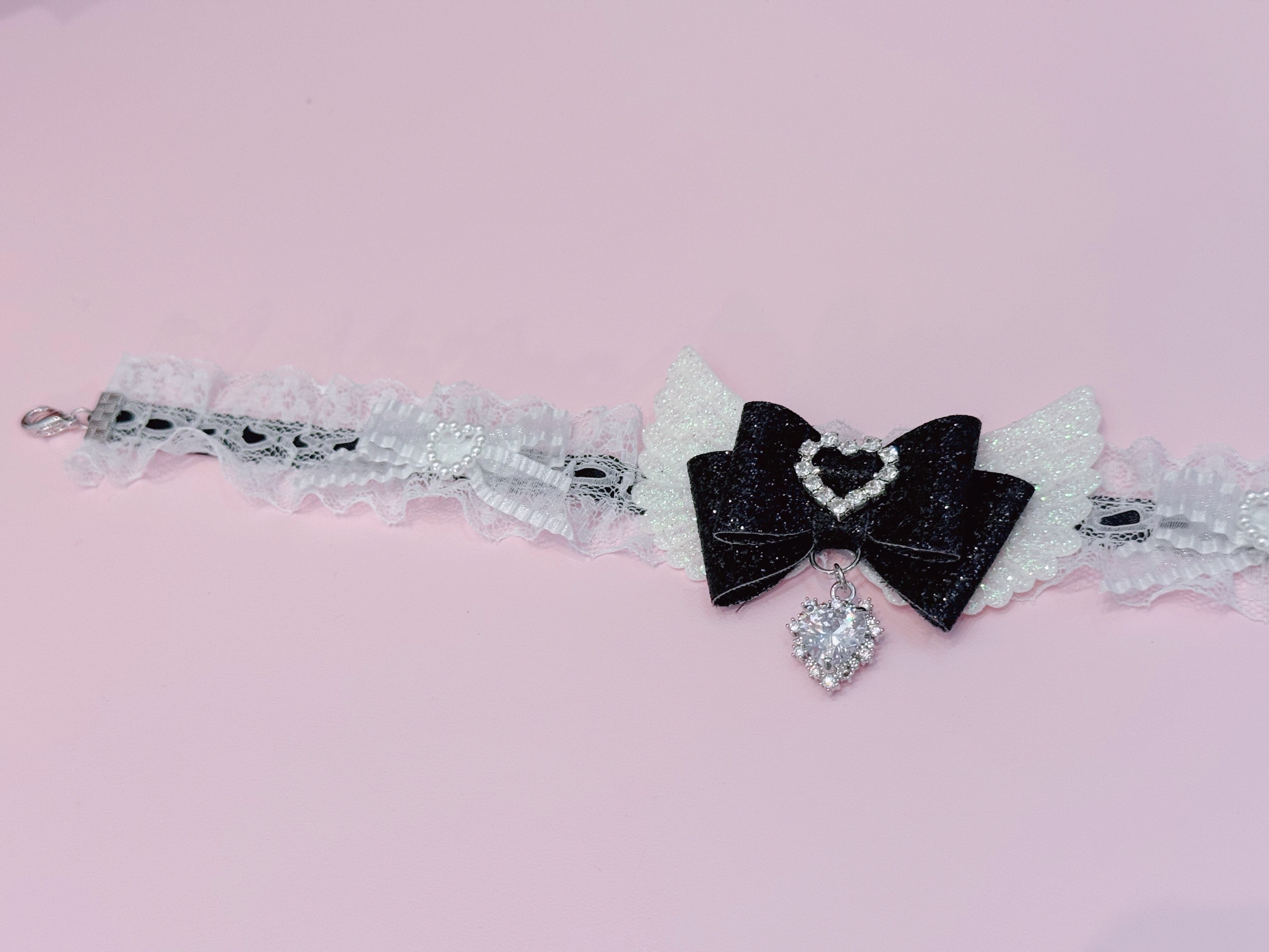 合皮のリボンにビジューのハート型のベルトバックルを真ん中に使用しております。