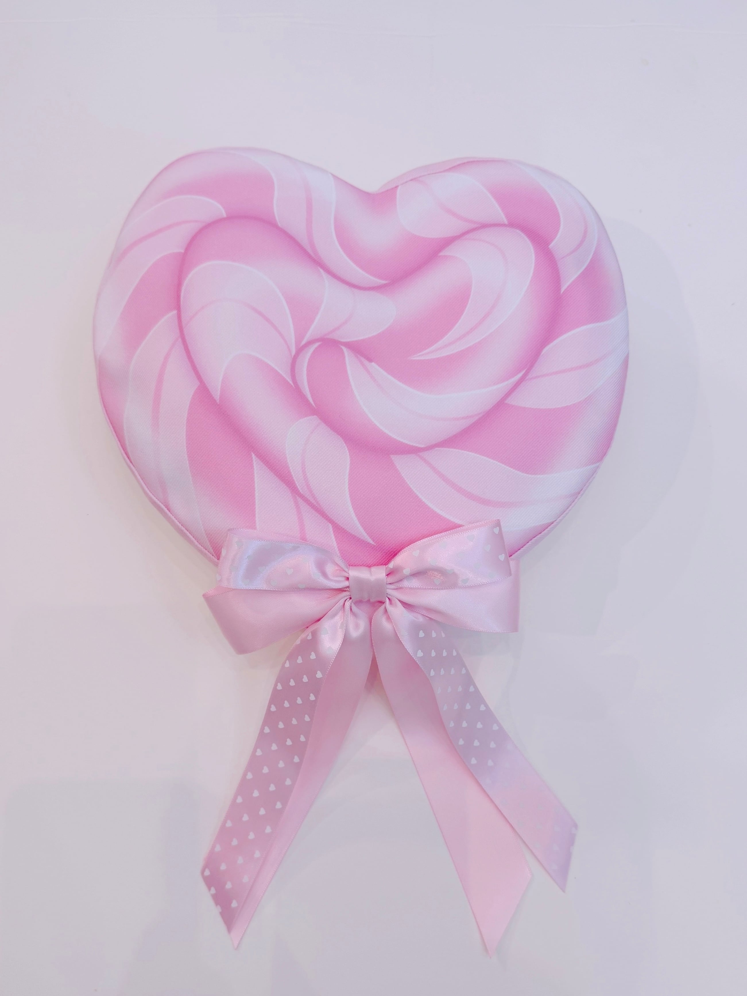 ふんわり丸みのあるハートシルエットに、ハート柄のドットリボンを添えて、可愛らしさを引き立てています。