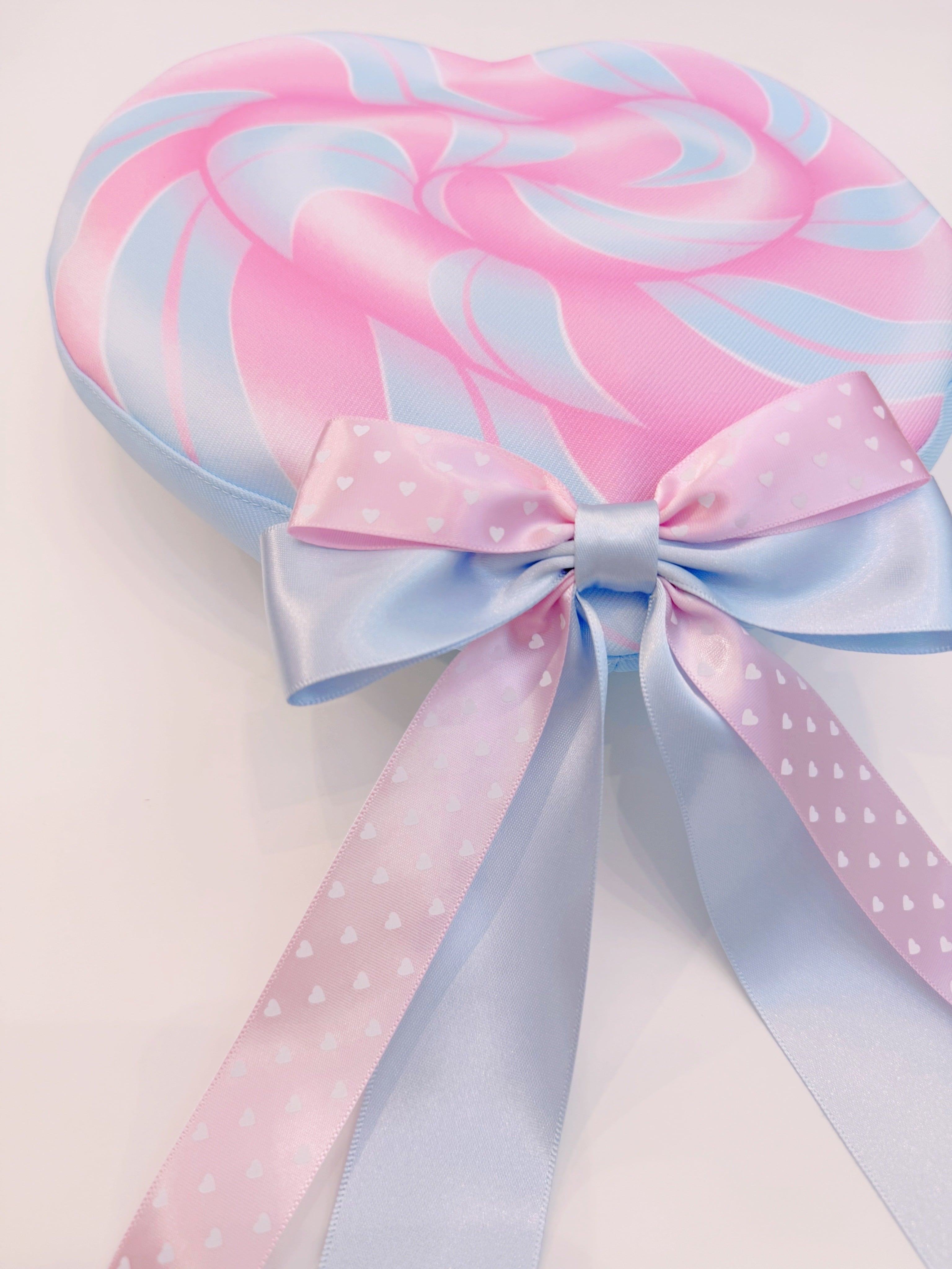 ふんわり丸みのあるハートシルエットに、ハート柄のドットリボンを添えて、可愛らしさを引き立てています。
