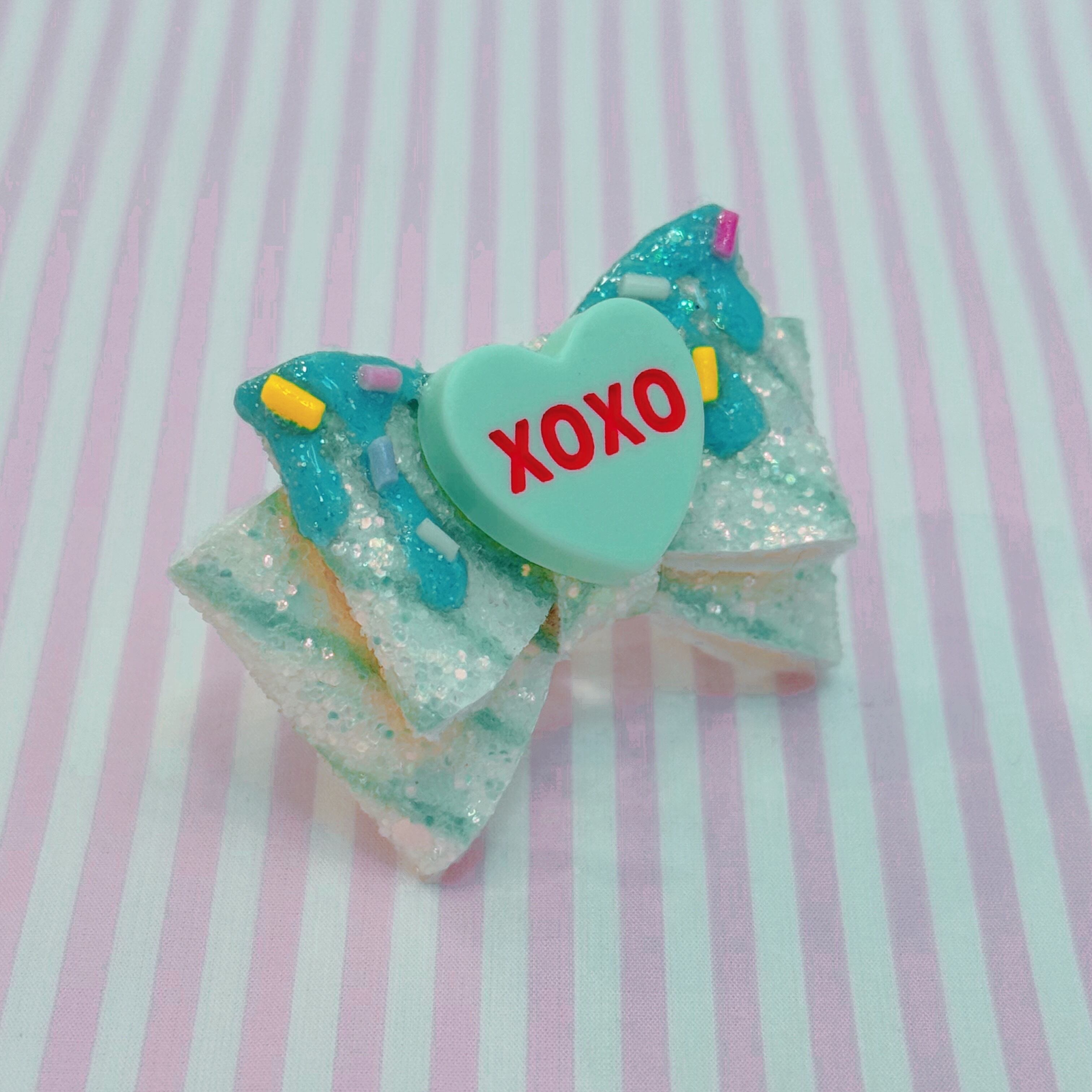 リボンの中央には、シュガーハートのパーツが主役で、「BE MINE」「HUG ME」など、キャンディのメッセージが可愛らしさを引き立てます。