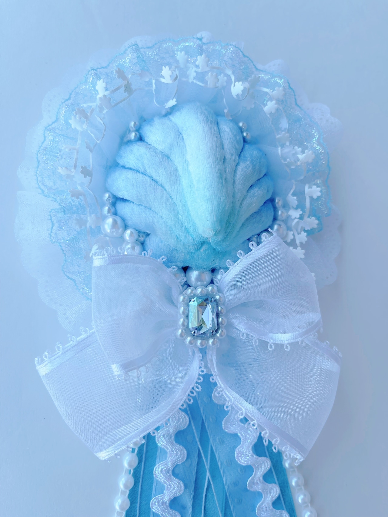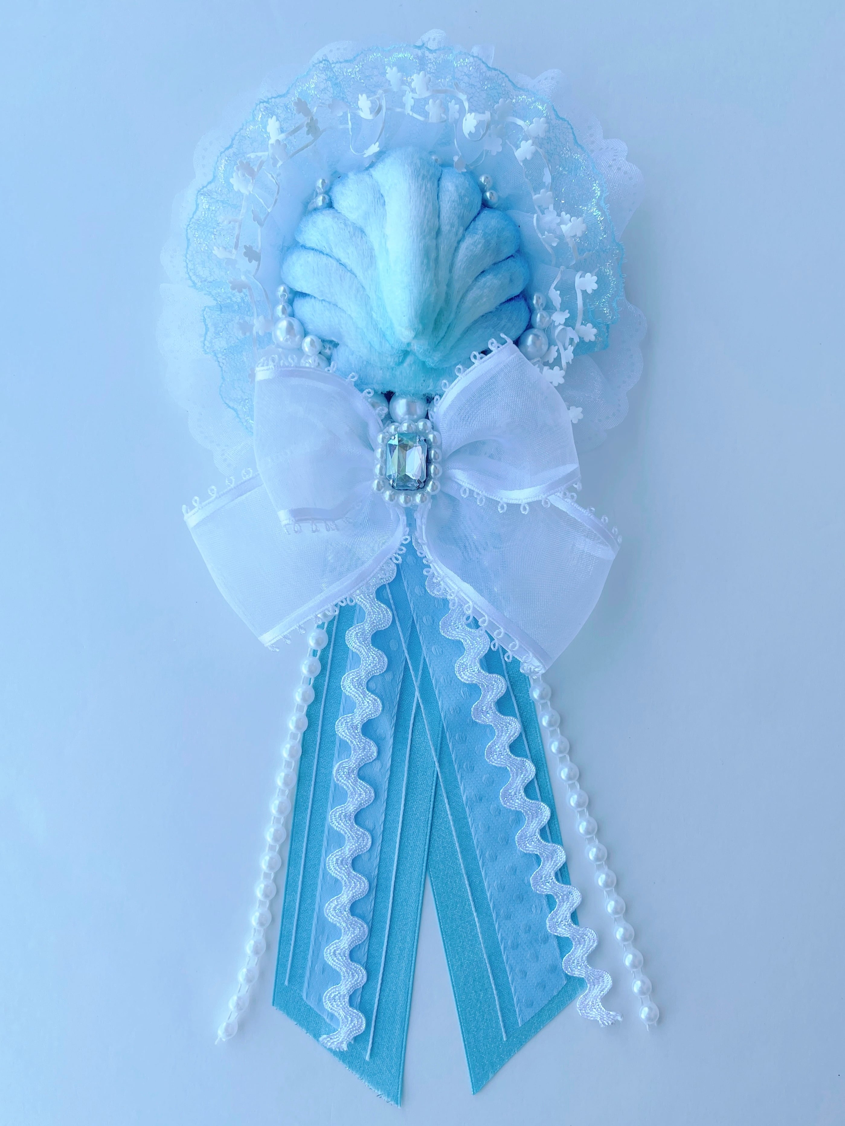 オーロラ入りのフリルとオーガンジーやサテンのリボンを使って人魚の宝石箱から取り出したようなロゼッタを制作いたしました。