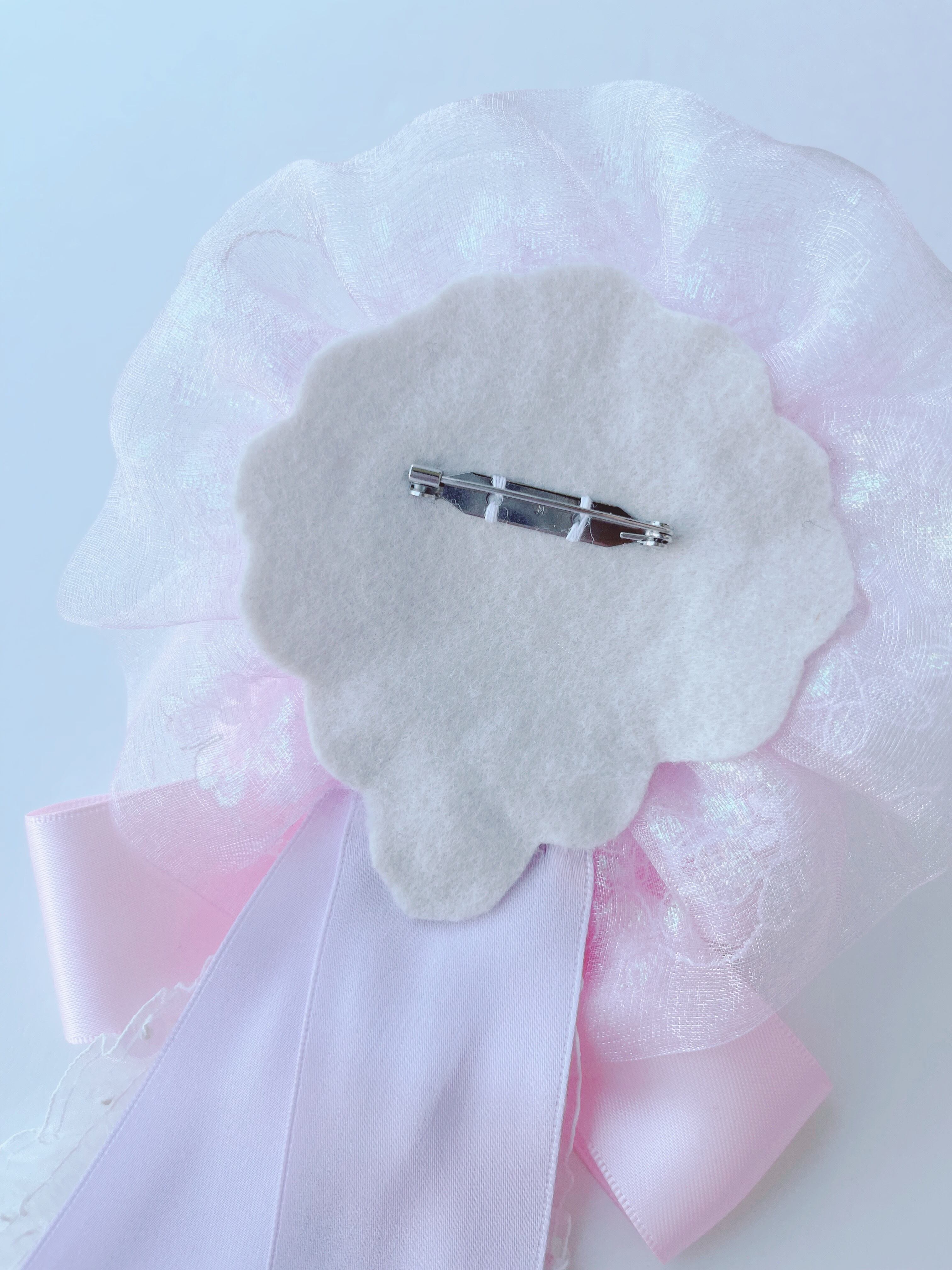オーロラ入りのフリルとオーガンジーやサテンのリボンを使って人魚の宝石箱から取り出したようなロゼッタを制作いたしました。